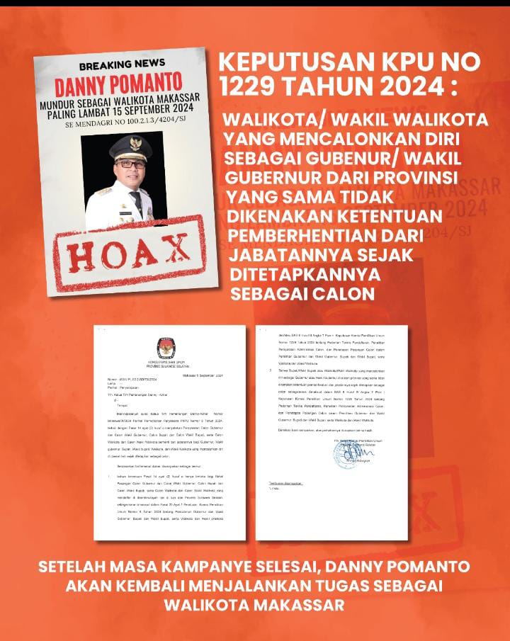 “Pak Danny Pomanto tidak memiliki kewajiban mundur dari jabatannya selaku Walikota Makassar, sesuai dengan Keputusan KPU No. 1229 tahun 2024. Jadi informasi yang beredar selama ini, menurut saya adalah informasi yang menyesatkan,” kecamnya.